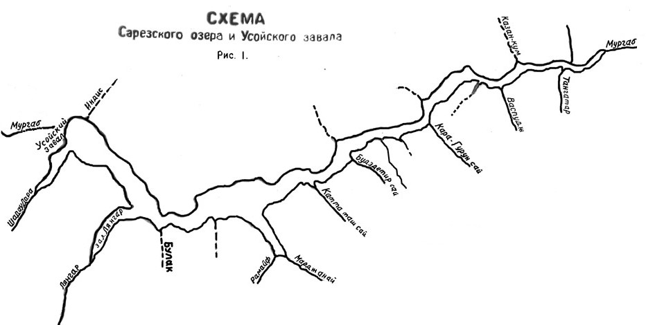 В ночь с 5 на 6 февраля 1911 г. на Памире произошел громадный обвал: обрушилась часть горного склона р. Бартанг (Мургаб), завалившая кишлак Усой с его жителями. Сила обвала была такова, что от вызванной им сейсмической волны, зарегистрированной Пулковской обсерваторией (4), были разрушены окрестные кишлаки и населенные пункты восточной части Афганистана. Этот завал получил название "Усойского" по имени погибшего кишлака. Возникшая плотина дала начало образованию нового, быстро растущего озера, которое затопило в дальнейшем кишлак Сарез. В память погибшего селения это озеро стало именоваться "Сарезским".