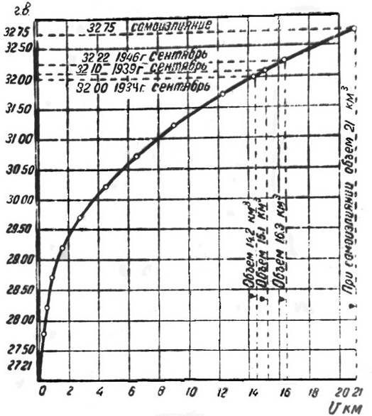 В режиме уровня озера разница между средним восьмилетним максимумом и минимумом составляет 7.6 м. Абсолютная амплитуда колебания уровня за год составляет 11.4 м (1942). И, что самое важное, мы видим продолжение постепенного и сильного повышения уровня воды Сарезского озера: с 1939 по 1946 г. уровень воды в озере поднялся по меженям на 7.36 м. В среднем за год уровень озера, несмотря на увеличивающуюся фильтрацию воды через завал, поднимается на 152 см. Как видно по кривой зависимости объема озера от горизонта воды (рис. 3), с момента образования озера подъем уровня шел чрезвычайно быстро, но с началом фильтрации воды через завал и увеличением площади зеркала озера подъем стал более пологим и постепенным.