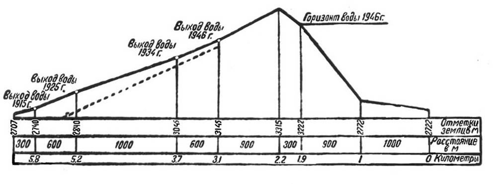 Точка выхода воды в овраге на 90 м ниже, чем горизонт воды в озере (рис. 4). Низшая точка завала находится на 50-55 м выше горизонта воды озера и на 140 м выше, чем выход воды в овраге. Температура воды в овраге была нами отмечена 8.3°, а в озере 12.5°. Измерения производились мной родниковым термометром в деревянной оправе. Как нетрудно видеть, температура фильтрующейся воды на 4° холоднее, чем на поверхности озера. Такую низкую температуру, вероятно, можно объяснить тем, что основная масса воды, поступающей в завал, идет на глубине 50-60 м.